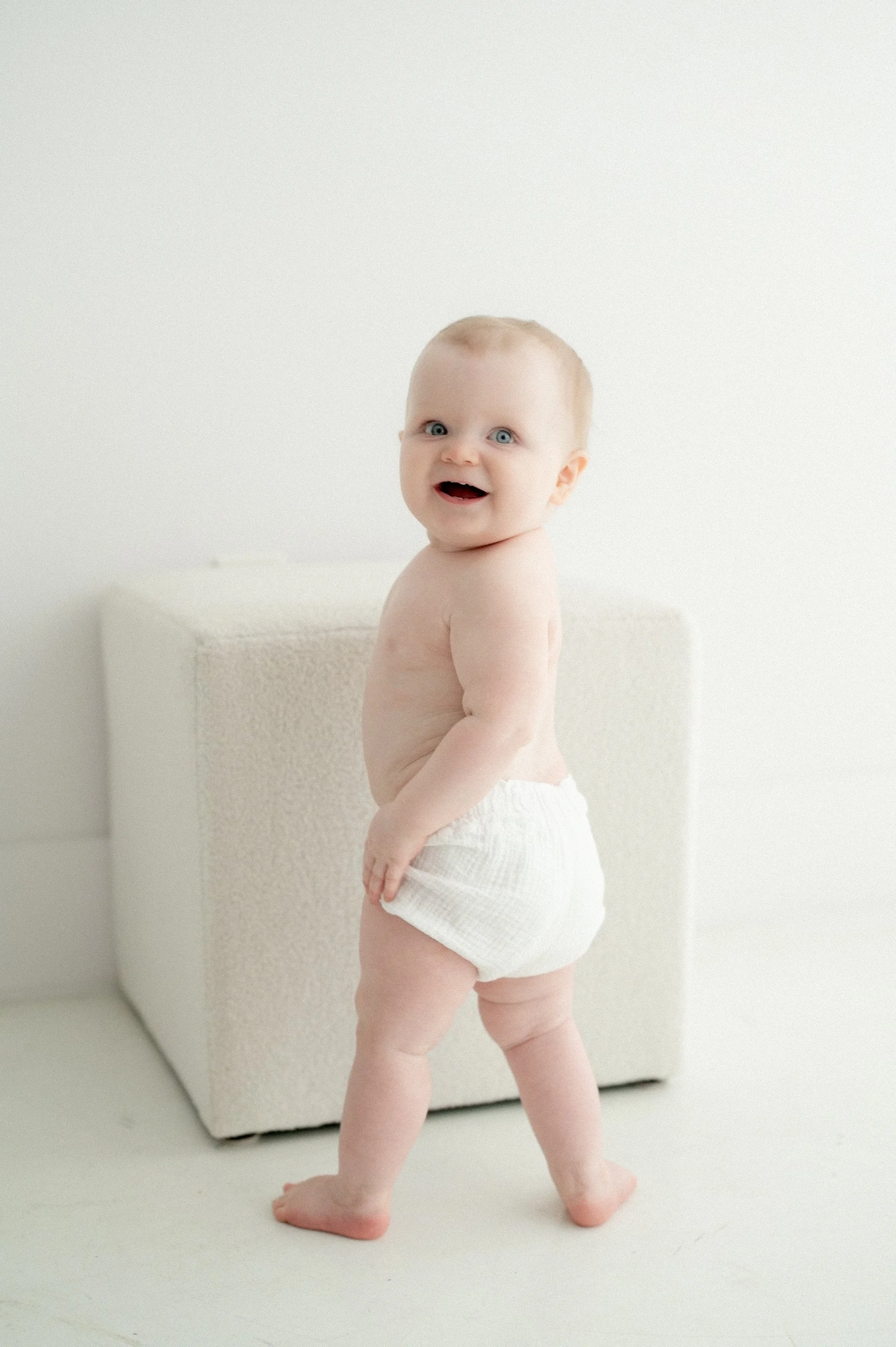 Simple and baby focused in my white studio. The session is quick so baby can get a bottle and a nap right on schedule. The session yields many cute images for you to love and cherish.